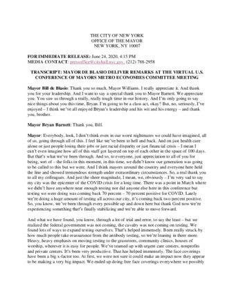 Mayor's Press Release: MAYOR DE BLASIO DELIVER REMARKS AT THE VIRTUAL U.S. CONFERENCE OF MAYORS METRO ECONOMIES COMMITTEE MEETING