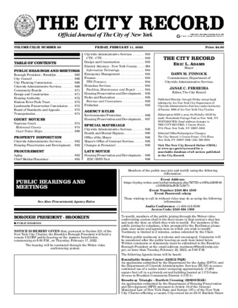 The City Record newspaper publishes notices which includes but is not limited to: public hearings and meetings, public auctions and sales, solicitations and awards and official rules proposed and adopted by city agencies.