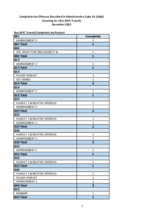 Pursuant to Admin Code Sect. 14-150(d), this monthly report contains information on complaints and arrests for violent felony offenses, assault, sex offenses, disorderly conduct, harassment, aggravated harassment, and offenses against public sensibilities that occurred in transit