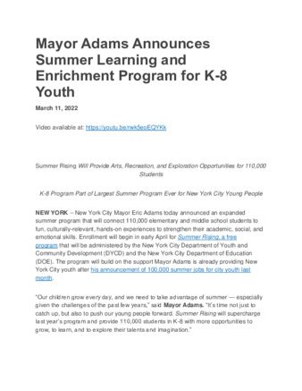 New York City Mayor Eric Adams today announces the Summer Rising program administered by the New York City Department of Youth and Community Development and the New York City Department of Education.