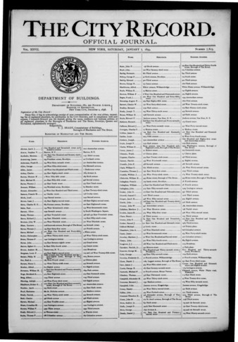 The City Record newspaper publishes notices which includes but is not limited to: public hearings and meetings, public auctions and sales, solicitations and awards and official rules proposed and adopted by city agencies. This is the City Record Newspaper for January 07, 1899.
