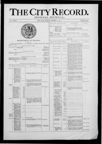 The City Record newspaper publishes notices which includes but is not limited to: public hearings and meetings, public auctions and sales, solicitations and awards and official rules proposed and adopted by city agencies. This is the City Record Newspaper for October 05, 1900.