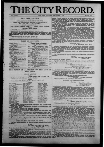 The City Record newspaper publishes notices which includes but is not limited to: public hearings and meetings, public auctions and sales, solicitations and awards and official rules proposed and adopted by city agencies. This is the City Record Newspaper for July 04, 1906.