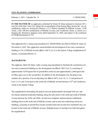 IN THE MATTER OF an application submitted by Munir M. Islam pursuant to Sections 197-c and 201 of the New York City Charter for an amendment of the Zoning Map, Section No. 15a, by establishing within an existing R2 District a C2-3 District bounded by Hillside Avenue, 215th Street, a line 100 etc.