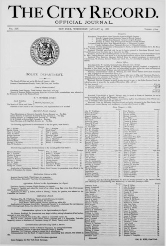 The City Record newspaper publishes notices which includes but is not limited to: public hearings and meetings, public auctions and sales, solicitations and awards and official rules proposed and adopted by city agencies. This is the City Record Newspaper for January 13, 1886.