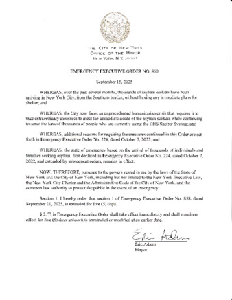 Emergency Executive Order No. 860, is being submitted to extend Emergency Executive Order No. 858, dated September 10, 2025; for five (5) days as it relates to the state of emergency based on the arrival of thousands of individuals and families seeking asylum.