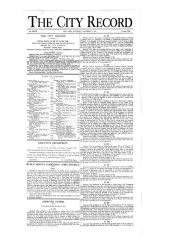 The City Record newspaper publishes notices which includes but is not limited to: public hearings and meetings, public auctions and sales, solicitations and awards and official rules proposed and adopted by city agencies. This is the City Record Newspaper for November 04, 1911.
