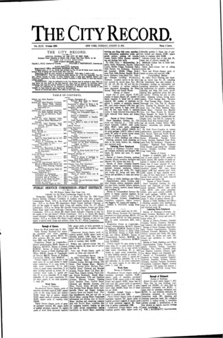 The City Record newspaper publishes notices which includes but is not limited to: public hearings and meetings, public auctions and sales, solicitations and awards and official rules proposed and adopted by city agencies. This is the City Record Newspaper for August 17, 1915.