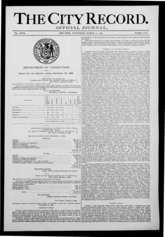 The City Record newspaper publishes notices which includes but is not limited to: public hearings and meetings, public auctions and sales, solicitations and awards and official rules proposed and adopted by city agencies. This is the City Record Newspaper for March 22, 1899.