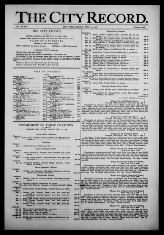 The City Record newspaper publishes notices which includes but is not limited to: public hearings and meetings, public auctions and sales, solicitations and awards and official rules proposed and adopted by city agencies. This is the City Record Newspaper for May 21, 1906.
