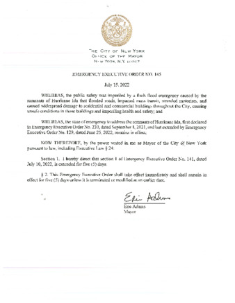 Emergency Executive Order No. 145, extends Emergency Executive Order No. 141, dated July 10, 2022, for five (5) days, if this is related to Hurricane Ida.