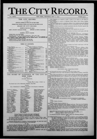 The City Record newspaper publishes notices which includes but is not limited to: public hearings and meetings, public auctions and sales, solicitations and awards and official rules proposed and adopted by city agencies. This is the City Record Newspaper for May 12, 1904.