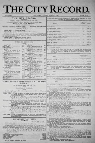 The City Record newspaper publishes notices which includes but is not limited to: public hearings and meetings, public auctions and sales, solicitations and awards and official rules proposed and adopted by city agencies. This is the City Record Newspaper for August 04, 1908.