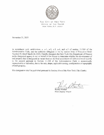 Designation of the Department of Finance Pursuant to Section 11-319 of the Administrative Code dated November 21, 2025; to act on behalf of the Mayor.