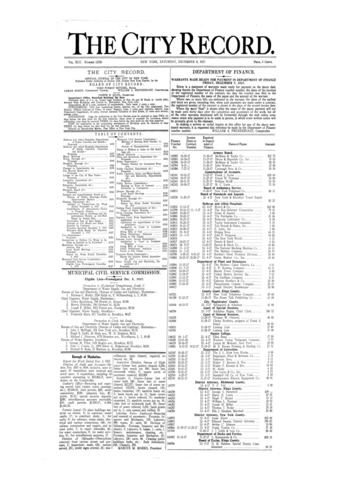 The City Record newspaper publishes notices which includes but is not limited to: public hearings and meetings, public auctions and sales, solicitations and awards and official rules proposed and adopted by city agencies. This is the City Record Newspaper for December 08, 1917.