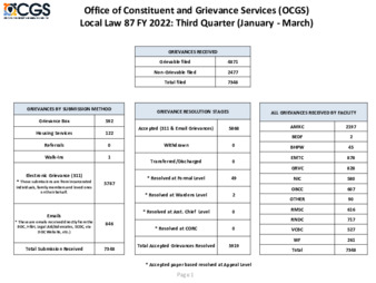 Pursuant to local law 87 of 2015, this report provides data on the number of grievances submitted by individuals in custody throughout the quarter disaggregated by the method of submission, facility and housing area of submission, category of the grievance, and whether the grievance was grievable.