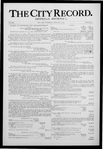 The City Record newspaper publishes notices which includes but is not limited to: public hearings and meetings, public auctions and sales, solicitations and awards and official rules proposed and adopted by city agencies. This is the City Record Newspaper for February 19, 1902.