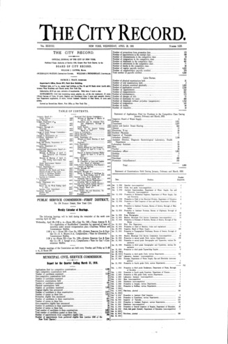 The City Record newspaper publishes notices which includes but is not limited to: public hearings and meetings, public auctions and sales, solicitations and awards and official rules proposed and adopted by city agencies. This is the City Record Newspaper for April 20, 1910.