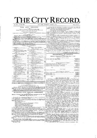 The City Record newspaper publishes notices which includes but is not limited to: public hearings and meetings, public auctions and sales, solicitations and awards and official rules proposed and adopted by city agencies. This is the City Record Newspaper for March 08, 1917.