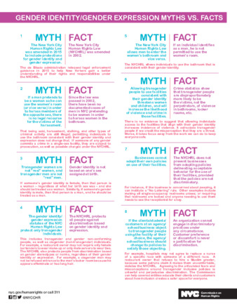 "Myth vs. Fact" factsheet tackling some common myths about gender identity and gender expression protections, and providing facts.