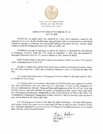 Emergency Executive Order No. 85, dated April 28, 2022, extends Emergency Executive Order No. 82, dated April 23, 2022 for five (5) days, as it relates to Hurricane Ida.
