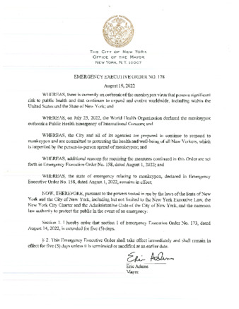 Emergency Executive Order No. 178, extends Emergency Executive Order No. 173, dated August 14, 2022, for five (5) days, if this relates to the monkeypox virus that poses a significant risk to public health.