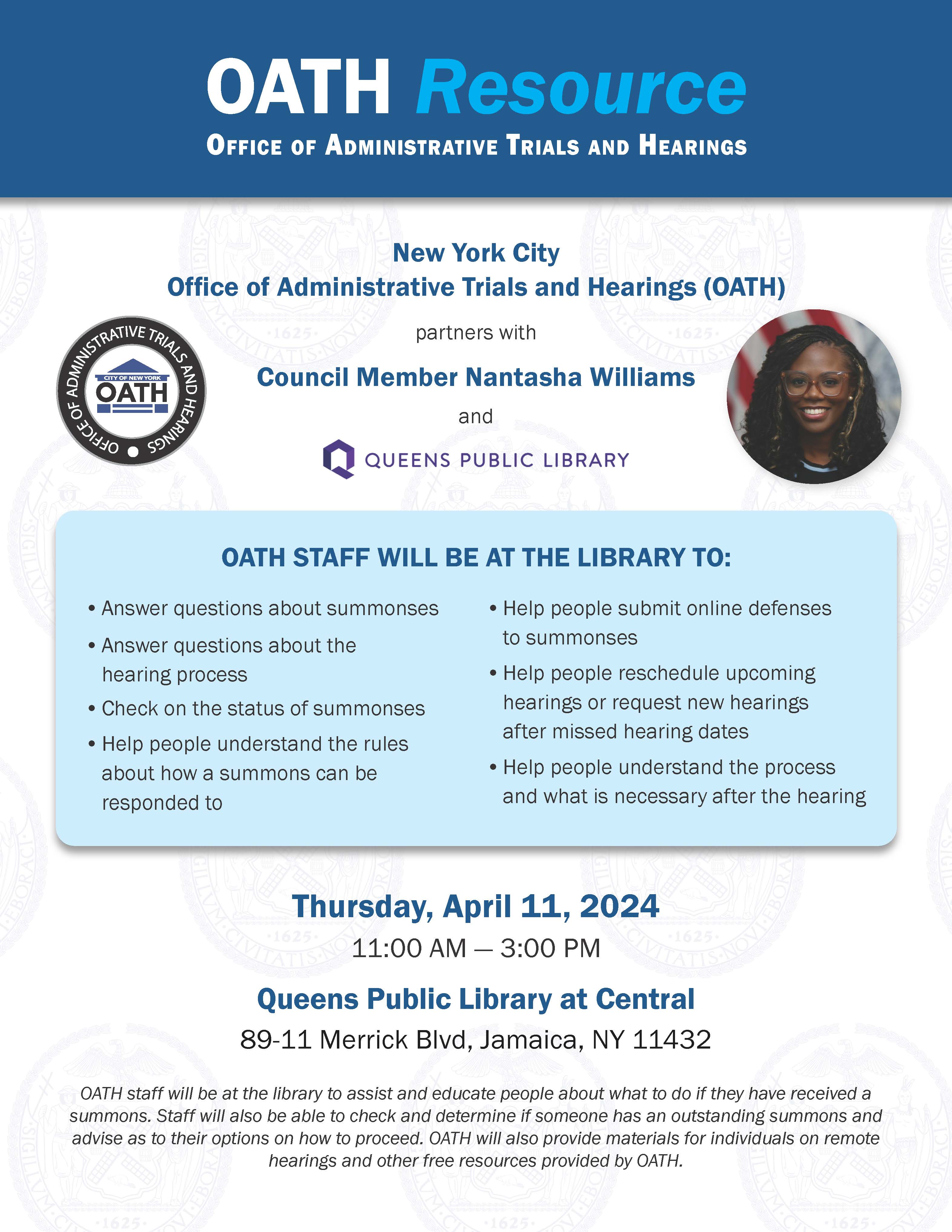 OATH staff were at the library to assist and educate people about what to do should they have received a summons and to check to determine if someone has an outstanding summons. Materials about remote hearings and other free resources were provided to the public as well.