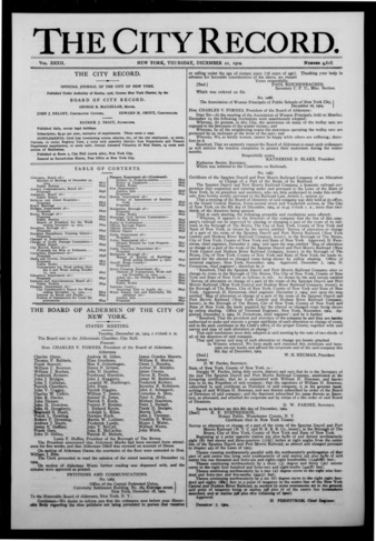 The City Record newspaper publishes notices which includes but is not limited to: public hearings and meetings, public auctions and sales, solicitations and awards and official rules proposed and adopted by city agencies. This is the City Record Newspaper for December 22, 1904.