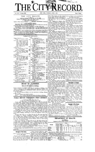 The City Record newspaper publishes notices which includes but is not limited to: public hearings and meetings, public auctions and sales, solicitations and awards and official rules proposed and adopted by city agencies. This is the City Record Newspaper for June 01, 1915.
