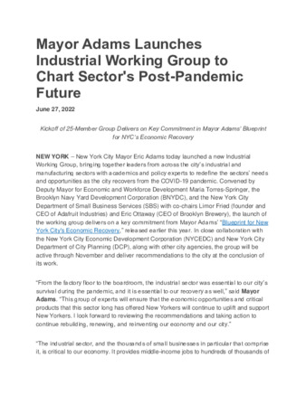 New York City Mayor Eric Adams launches a new Industrial Working Group, bringing together leaders from across the city’s industrial and manufacturing sectors with academics and policy experts to redefine the sectors’ needs and opportunities as the city recovers from the COVID-19 pandemic.