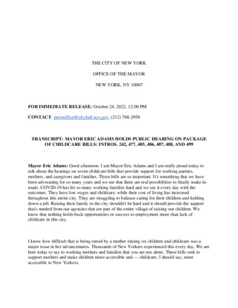 TRANSCRIPT: MAYOR ERIC ADAMS HOLDS PUBLIC HEARING ON PACKAGE OF CHILDCARE BILLS: INTROS. 242, 477, 485, 486, 487, 488, AND 499