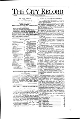 The City Record newspaper publishes notices which includes but is not limited to: public hearings and meetings, public auctions and sales, solicitations and awards and official rules proposed and adopted by city agencies. This is the City Record Newspaper for October 10, 1911.