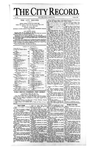 The City Record newspaper publishes notices which includes but is not limited to: public hearings and meetings, public auctions and sales, solicitations and awards and official rules proposed and adopted by city agencies. This is the City Record Newspaper for March 01, 1912 with supplement.