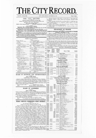 The City Record newspaper publishes notices which includes but is not limited to: public hearings and meetings, public auctions and sales, solicitations and awards and official rules proposed and adopted by city agencies. This is the City Record Newspaper for November 15, 1914.