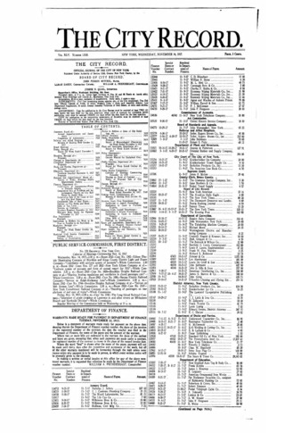 The City Record newspaper publishes notices which includes but is not limited to: public hearings and meetings, public auctions and sales, solicitations and awards and official rules proposed and adopted by city agencies. This is the City Record Newspaper for November 14, 1917.