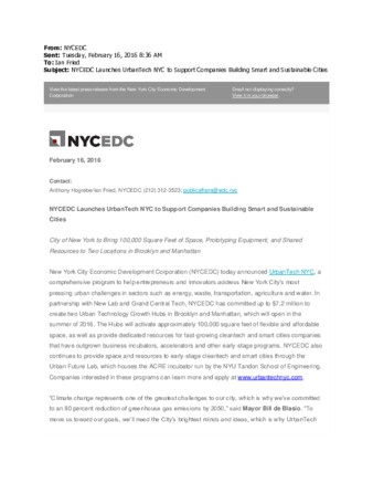 Mayor's Press Release: NYCEDC Launches UrbanTech NYC to Support Companies Building Smart and Sustainable Cities