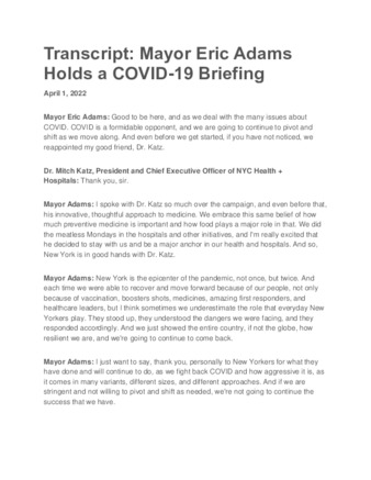 A transcript abbot Mayor Eric Adams holding a COVID-19 Briefing about COVID testing, treatments, and vacciination.