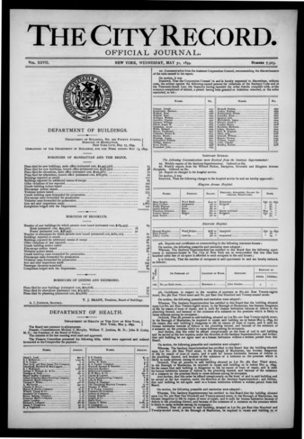 The City Record newspaper publishes notices which includes but is not limited to: public hearings and meetings, public auctions and sales, solicitations and awards and official rules proposed and adopted by city agencies. This is the City Record Newspaper for May 31, 1899.