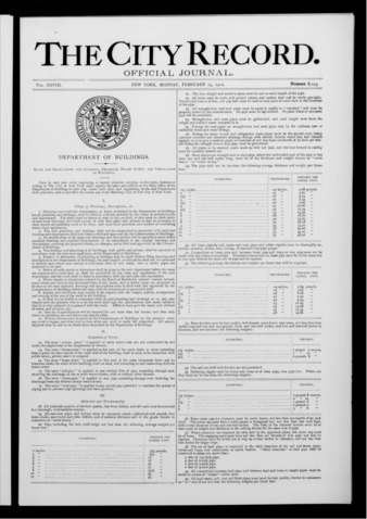 The City Record newspaper publishes notices which includes but is not limited to: public hearings and meetings, public auctions and sales, solicitations and awards and official rules proposed and adopted by city agencies. This is the City Record Newspaper for February 19, 1900.