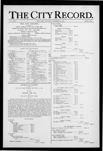 The City Record newspaper publishes notices which includes but is not limited to: public hearings and meetings, public auctions and sales, solicitations and awards and official rules proposed and adopted by city agencies. This is the City Record Newspaper for December 14, 1907.