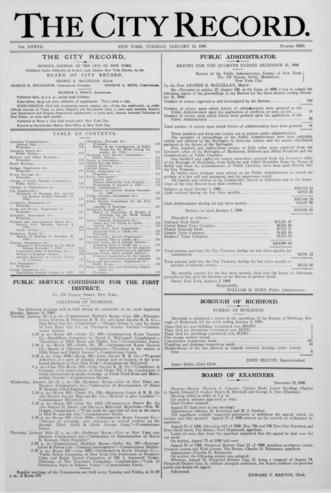 The City Record newspaper publishes notices which includes but is not limited to: public hearings and meetings, public auctions and sales, solicitations and awards and official rules proposed and adopted by city agencies. This is the City Record Newspaper for January 12, 1909.