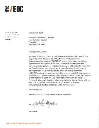 A quarterly report on EDC’s expenditure, as well as, retention or designation of persons or organizations to engage in lobbying or lobbying activities before the council or any member thereof, the city planning commission, a borough president, a borough board or a community board.