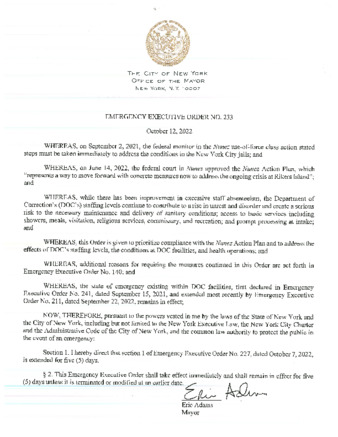 Emergency Executive Order No. 233, will extend Emergency Executive Order No. 227, dated October 7, 2022, for five (5) days, if this relates to Rikers.