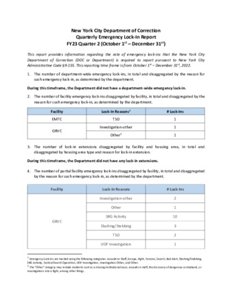 Pursuant to Local Law 164 of 2018, this report provides information related to emergency lock-ins within city jail facilities, including the number of lock-ins, duration of lock-ins, as well as programming and service interruptions.