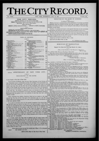 The City Record newspaper publishes notices which includes but is not limited to: public hearings and meetings, public auctions and sales, solicitations and awards and official rules proposed and adopted by city agencies. This is the City Record Newspaper for May 27, 1903.