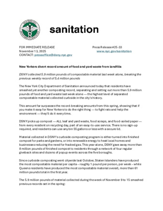 DSNY collected 5.9 million pounds of compostable material last week alone, breaking the previous weekly record of 5.4 million pounds.