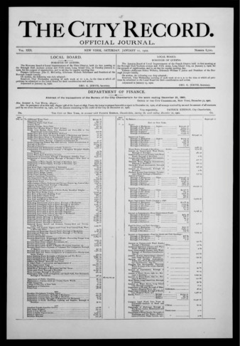 The City Record newspaper publishes notices which includes but is not limited to: public hearings and meetings, public auctions and sales, solicitations and awards and official rules proposed and adopted by city agencies. This is the City Record Newspaper for January 11, 1902.