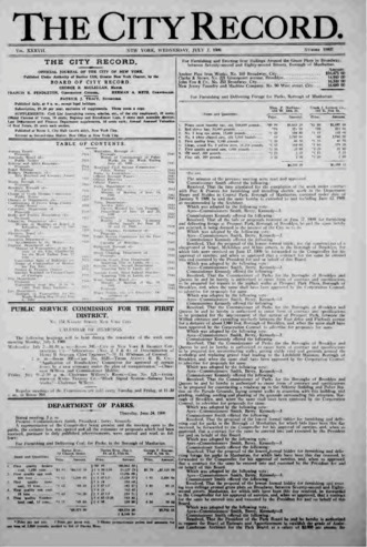 The City Record newspaper publishes notices which includes but is not limited to: public hearings and meetings, public auctions and sales, solicitations and awards and official rules proposed and adopted by city agencies. This is the City Record Newspaper for July 07, 1909.