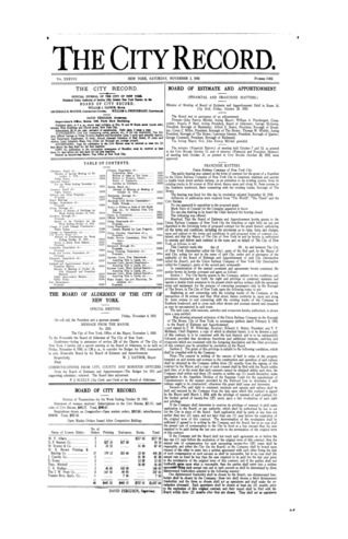 The City Record newspaper publishes notices which includes but is not limited to: public hearings and meetings, public auctions and sales, solicitations and awards and official rules proposed and adopted by city agencies. This is the City Record Newspaper for November 05, 1910.