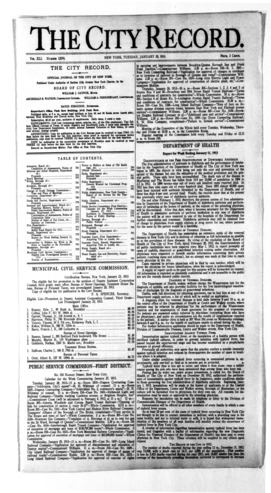 The City Record newspaper publishes notices which includes but is not limited to: public hearings and meetings, public auctions and sales, solicitations and awards and official rules proposed and adopted by city agencies. This is the City Record Newspaper for January 28, 1913.